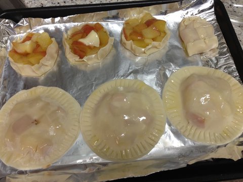 3. 호일에 버터를 바르고 다 만든 애플 파이에도 버터 칠을 해주세용 그래야 노릇 노릇 고소한 맛이 나여. 계란 노른자 이용해도 됩니다!