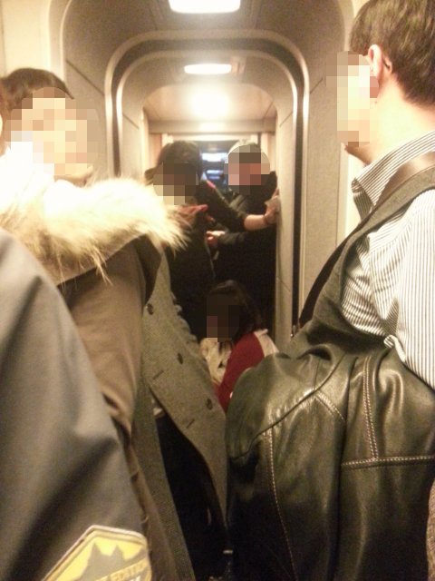 열차연결칸만 이런게 아니라 좌석통로에도 사람들이 꾹꾹 눌러담아져있음