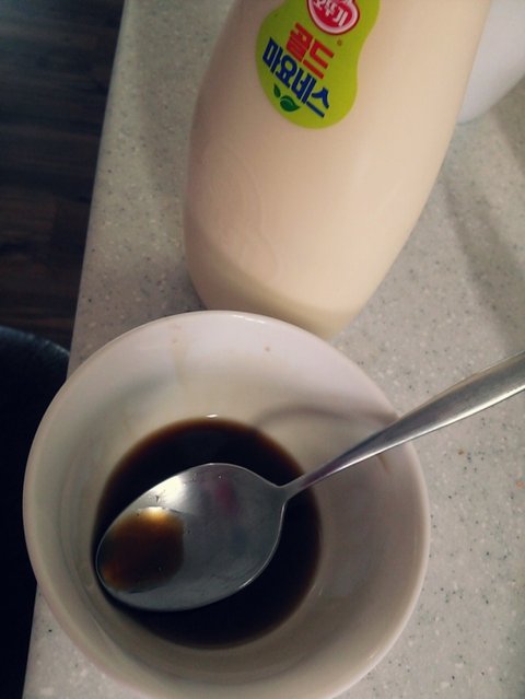 소스는 마요네즈와 간장소스인데요 저는간장소스를 간장과 올리고당 1:1비율로 한스푼 반씩 했어요