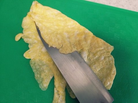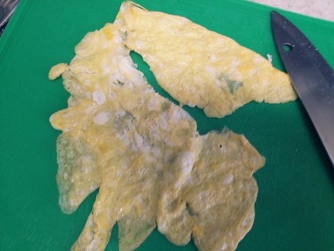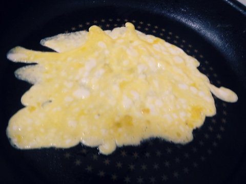닭알을 풀어 소금간을 하고 지단을 붙여줍니다. 스크램블 로도 가능해여