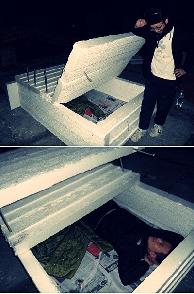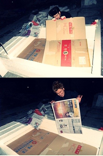 추위로 얼어죽을까봐 박스와 신문지로도 무장했음
