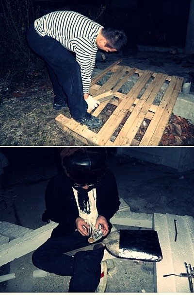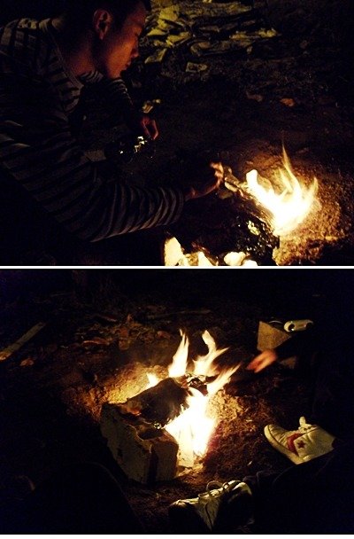 땔감을 장만하고 나는 삽헤 호일 싸서 프라이팬을 만들었음