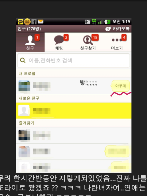 이름 까먹고 나중에 또 물어볼까봐 얼른 카톡메인화면으로 감 친구 첨에 추가하면 노란색으로 맨위에 뜨지 않슴 ?? 클릭 하구 바로
