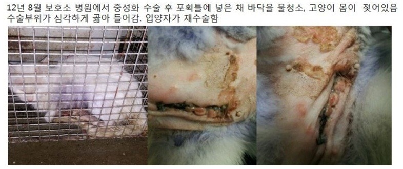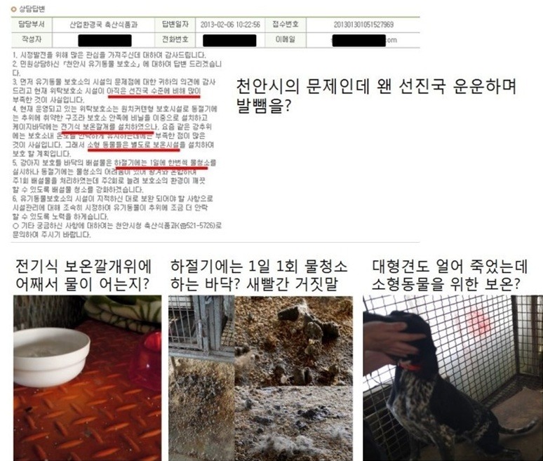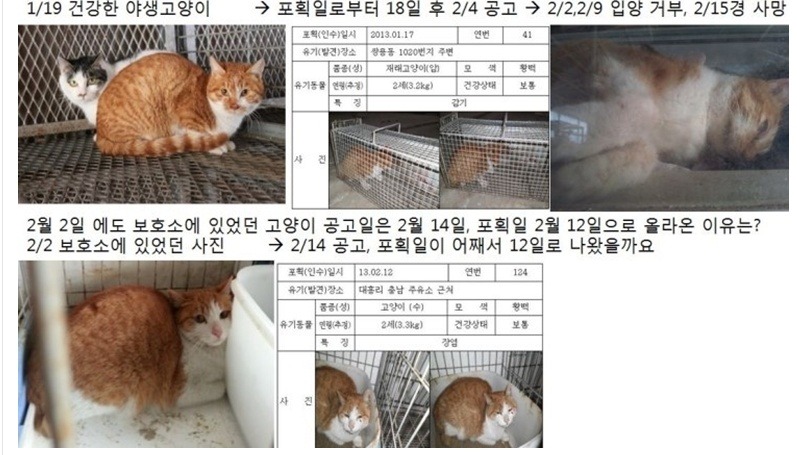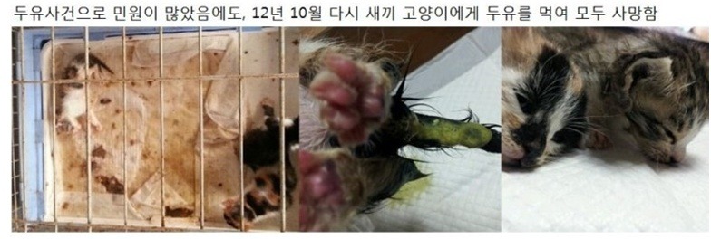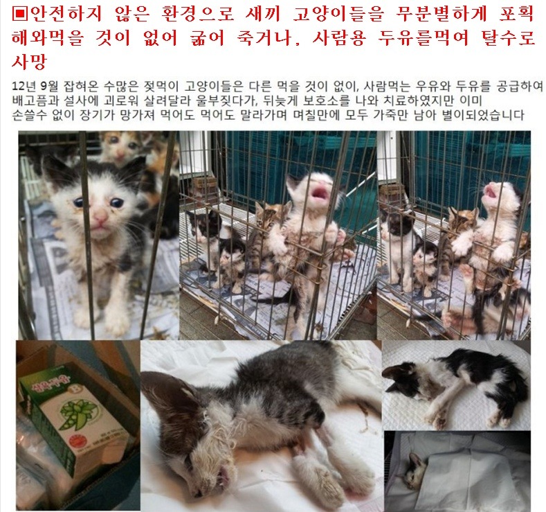1) 동물 보호센터에 입소되는 모든 동물은 안전하고 위생적이며 불편함이 없도록 관리하여야 하나 하절기에는 방충시설이 없어 구더기와 파리떼, 모기떼에 시달리며 동절기에는 보온시설이 없어 혹한의 추위를 그대로 받도록 되어있어 면역이 떨어지게 되며, 어미젖을 떼지 못한 어린 고양이를 보호중에 적절한 먹이를 공급하지 않고 장손상을 유발할수 있는 사람용 두유를 공급하여 10마리 이상의 고양이들을 사망에 이르게한 절대적인 원인 제공을 함