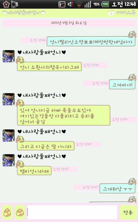 5.어느날은 내가 혼자 컴퓨터를 키곤 클럽노래를 들으며 신나게 춤을 추고 소리를 지르고 있었음 집에 아무도 없기때문에 뿜뽜!스튁!!에아!!요우! 이러면서 그런데 갑자기 누가 내 방문을 염... 둘째언니가 야내친구들왔는데,니쫌더크게불르래 그리고 뒤를 보니 내가갈 학교에 훈남 선배들이였음.. 그날 문잠그고 소리지르면서 울음..근데 밖에서 훈남오빠들이 야,니동생쫌어떻게해줘야되는거아냐? 그리고 언니가 문을따고 들어오더니 초코파이 하나를 던지고 불끄고 나감ㅋㅋㅋㅋㅋㅋㅋㅋㅋㅋㅋㅋ 아..언니의정이란.♥