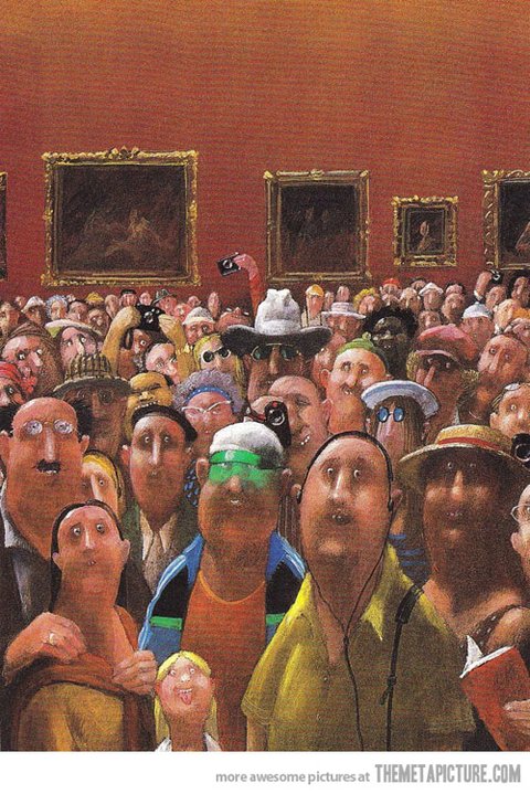 저는 뭔가 군중심리의 비판인듯 뭐가 예술성이 있는지 판별못하는 사람들이 가치가 있다는 그림이기때문에 그냥 보러오는듯한 그 그림의 참뜻을 이해하지못하는 일반적인 사람들. 그렇기때문에 가볍게 보러온듯한느낌? 근데 모순인게 많은 대작들의 예술그림을보면 와 멋지다 라기보다 난해한것같음. 그걸 이해하는 사람이 몇이나 될까 ...