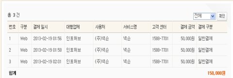2013.2.19 새벽 2시경 총 3번에 걸쳐 5만원씩 15만원이 결제되었습니다.