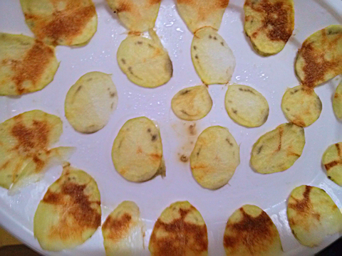 수제감자칩. 저녁에 감자칩이 너무 먹고싶었습니다. 하지만 마트가기 귀찮아 집에서 굴러다니는 감자를 얇게 썰어서 전자렌지에 그냥 돌림.