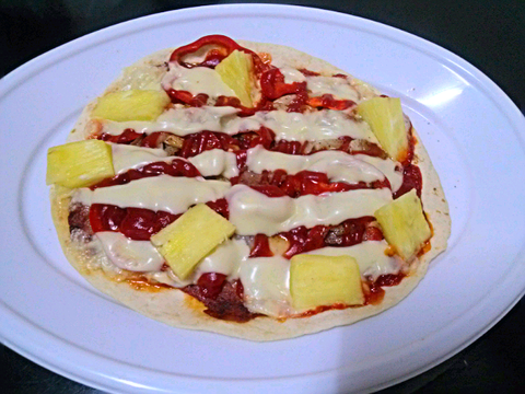 피자가 먹고 싶어서 만든 또띠아하와이안피자. 치즈와 케찹에 가렸지만 토핑에 쓰인 재료가 많아요.