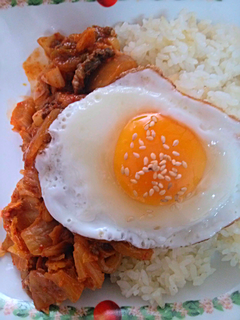 볶음김치덮밥. 계란은 머니머니해도 반숙이 최고죠.