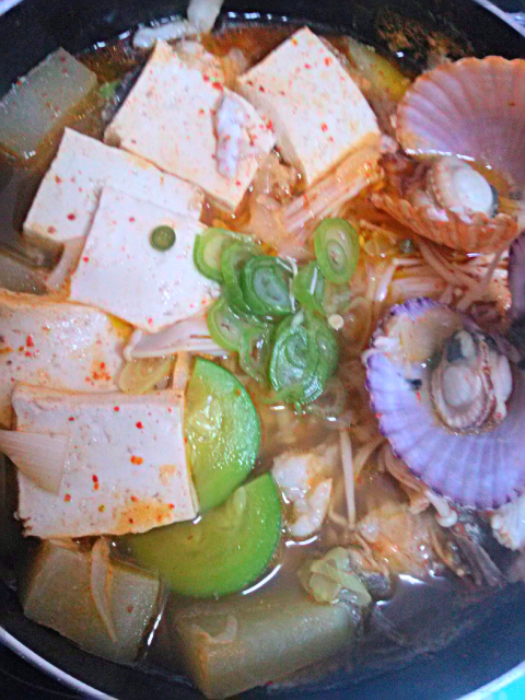우럭매운탕. 자전거여행하다가 그냥 지나칠 수 없었던 회센터에서 우럭과 밀치를 사니 아주머니께서 주신 탕감으로 만들었어요. 가리비도 주셨어요. 센스있게 가리비 색깔맞춰주셨네요.