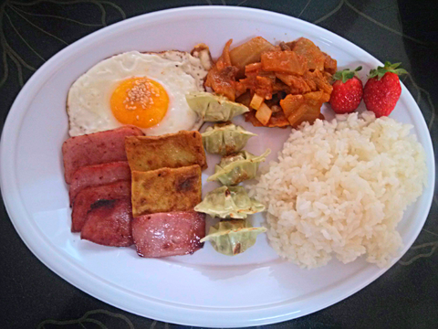 이것은 흔하게 먹는 밥상. 옆집사는 친구가 딸기 사다줬어요.