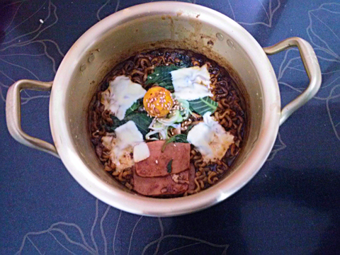 짜파XX도 흔하게 먹을순 없다!! 치즈를 올려 만든 치즈짜파티. 닭알의 유통기간이 다되어 삶아서 넘쳐나는 것을 데코로 이용.