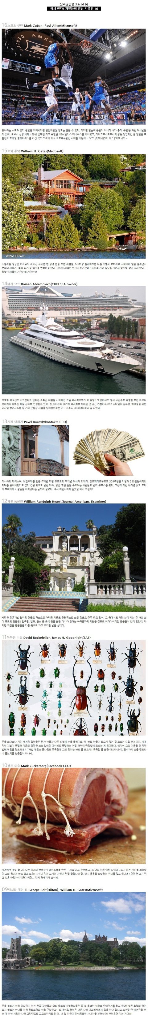 모바일배려 15~11 남자공감랭크쇼 M16 허세 쩐다! 재벌들의 별난 지름신 16 16 스포츠 구단 Mark Cuban, Paul Allen(Microsoft) 좋아하는 스포츠 경기 관람을 위해서라면 연간외원권 정도는 끊을 수 있지. 하지만 단순히 응원이 아니라 내가 좋아 '구단'을 차린 허세남들이 있어. 포브스 서정 세계 459위 갑부인 마크 큐반은 NBA 델러스 메버릭스를 사버렸고, 마이크로소프트 공동 창업자인 폴 앨런은 포틀랜드 트레일 블레이저스를 가진 것도 모자라 미국 플축구팀인 시애틀 사운더스 FC도 겟 해버렸어. 왜? 좋아하니까~ 15 호화 주택 William H. Gates (Microsoft) 노동자들 임금은 아까워도 자기집 꾸미는 덴 펑펑 돈을 쓰는 재벌들. MS회장 빌게이츠는 다른 재벌과 호화저택 꾸미기에 열을 올리면서 분수대 세우기ㅡ 호수 파기 등 별짓을 반복하질 않나, 인도의 재벌은 빈민가 한가운데 1조짜리 거대 빌딩을 지어서 왕처럼 살고 있지 않나... 정말 허세들이 가관이네 가관이야 14 메가 요트 Roman Abramovich (CHELSEA owner) 초호화 여객선도 시끄럽다고 안타는 초특급 재벌들 사이에서 요즘 럭셔리요트가 대 유행! 그 중에서도 첼시 구단주로 유명한 로만 아브라모비치의 요트는 레알 갑으로 인정받고 있어. 집 2체짜리 크기에 럭셔리로 도배된 건 당근 기본이고 007 스타일의 잠수정, 해적드을 위한 미사일 방어시스템 등 거의 군항급 시설을 탑제중이라는거~ 가격도 5000억대라니 말 다했네. 13 지폐 날리기 Pavel Durov (Vkotakte CEO) 러시아의 페이스북 브깐땍제를 만든 IT재벌 파발 듀로프의 무개념 허세가 화제야. 상트페테스부르크 309주년을 기념해 230만원어치의 지폐를 종이비행기로 접어 건물 밖으로 날린거야. 당근 밖은 돈을 주으려는 사람들로 난리 부르스를 췄지. 그런데 이런 무개념 짓도 모라자 트위터에 사람들을 비아냥대는 글까지 올렸대. 역시 어린 나이에 돈맛을 봐서 그런가? 12 개인 동물원 William Randolph Hearst (Journal American, Examiner) 사망한 언론 재벌 윌리엄 랜돌프 허스트의 저택은 지금도 관광명소로 쓰일 정도로 주목 받고 있어. 그 중에서도 가장 눈에 띄는건 사상 최대 규모의 동물원! 얼룩말, 엘크, 들소 등 초식 동물 뿐만 아니라 한때는 북극곰까지 키웠을 정도로 버라이어틱한 동물들이 함께 있었대. 하지만 지금은 동물들은 다른 곳으로 가고 우리만 남은 상태야. 11 독특한 수집 David Rockfeller, James H. Goodnight (SAS) 돈을 쓰다쓰다 지친 세걔적 갑부들은 뭔가 남들과 다른 방법에 눈을 돌리기도 해. 바로 남들이 모으지 않는 걸 모으는 수집 본능이야. 세계적인 재벌가 록펄러 가문의 짱짱한 보스 할배인 데이비드 록펠러는 어릴 때부터 딱정벌레 모으는게 취미였대. 심지어 그의 이름을 딴 딱정벌레가 있을 정도라네? IT재벌 제임스 굿나잇도 독특한데 그의 취미는 바로 돌 모으기! 독특한 돌 뿐만 아니라, 화석, 운석까지 손을 정도라니 돌보리는 황금같이 하나봐.