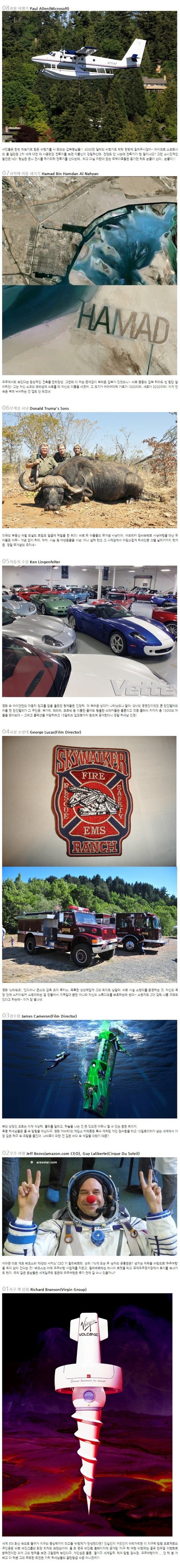 모바일배려 05~01 05 자동차 수집 Ken Lingenfelter 영화 속 아이언맨의 자동차 창고를 침을 흘렸던 형제들은 긴장해. 더 부러운 상대가 나타났으니 말야. GM의 경영진이었던 론 린진펠터의 아들 켄 린진펠터가 그 주인공. 부가티, 페라리, 포르쉐 등 이름만 들어도 황홀한 슈퍼카들은 물론이고 각종 클래식 카까지 총 150대의 차들을 모아났대~ 그리고 콜렉션을 자랑하려고 15달라의 입장표까지 받으면 공개한다니 정말 허세남 인정! 04 사설 소방대 George Lucas (Film Director) 영화 '스타워즈', '인디아나 존스'의 감독 조지 루카스. 독특한 상상력답게 그의 취미도 남달라. 바로 사설 소방대를 운영하는 것. 자신의 목장 안에 사크이워커 소방대라는 걸 만들어서 지역일대 뿐만 아니라 자신의 스튜디오를 보호하는데 쓴대~ 소방차도 2대 갖춰 나름 규모도 있다고 하는데~ 이거 참 별나네 03 잠수함 James Cameron (Film Director) 부의 상쟁인 요트는 이제 식상해. 물위를 달리고, 하늘을 나는 건 돈 있으면 아무나 할 수 있는 흔한 취미지. 폭풍 허세남들은 물 속 탐험을 떠난다구. 영화 '아바타'의 제임스 카메론은 특수 제작된 개인 잠수함을 타고 10킬로미터가 넘는 세계에서 가장 깊은 해구 속 유람을 즐긴다. 나비족이 파란 건 깊은 바다 속 색깔을 따왔기 때문? 02 우주 여행 Jeff Bezos (amazon.com CEO), Guy Laliberte (Cirque du Soleil) 아마존 대표 제프 베조스와 '태양의 서커스' CEO 기 랄리베르테. 상위 1%에 드는 두 남자의 공통점은? 넘치는 재력을 바탕으로 '우주여행'을 취미 삼아 간다는 것! 베조스는 아예 우주비행 사업체를 차렸고, 랄리베르테는 러시아 로켓을 타고 국제우주정거장에서 휴가를 보내기도 했지. 우리 같은 흔남들은 세계일주도 힘든데 우주여행은 죽기 전에 갈 수나 있을까나? 01 지구 핵 탐험 Richard Branson (Virgin Group) 세계 5대 화산 속으로 들어가 지구의 중심핵까지 파고들 '비행체'가 탄생했다며? 진실인지 거짓인지 아리까리한 이 지구핵 탐험 프로젝트의 주인공은 바로 버진그룹의 회장 리처드 브랜슨이야. 올 초 영국 버진社 홈페이지에 공개된 '지구 핵 여행 비행체'는 결국 만우절 이벤트로 밝혀졌지만 과거 그의 행적을 보면 그럴듯해 보인다구. 개인섬은 물론, 열기구 세계일주, 해저 탐험 잠수정, 우주여행까지... 안 해 본 거 빼고 다 해본 그의 무모한 도전은 가히 허세남들의 끝판왕급 수준 아니겠어?!