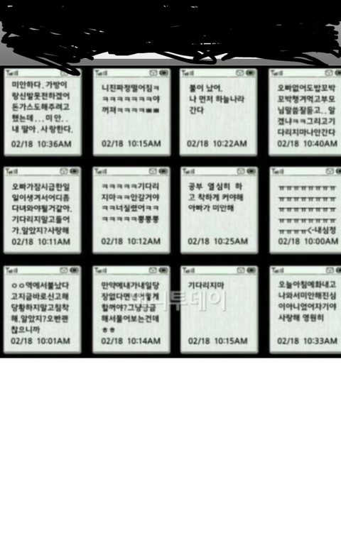 모바일 배려 미한하다. 가방이랑 신발 못전하겟어 돈가스도 해주려고 했는데..미안.. 내딸아. 사랑한다. 02/08 10:36 AM 니 진짜 정떨어짐ㅋㅋㅋㅋㅋ 야꺼져ㅋㅋㅋㅋ (아무래도 사랑하는 연인을 보낼려는듯한 문자) 02/18 10:15AM 불났어. 나 먼저 하늘나라간다 02/18 10:22AM 오빠없이도 밥꼬박꼬박 챙겨먹고 부모님말씀잘듣고..알겟냐ㅋㅋㅋ 그리고 기다리지마 안간다. 02/18 10:40AM 오빠 잠시 급한일이 생겨서 어디쫌다녀와야할것같다 기다리지말고 들어가. 알았지? 사랑해 02/18 10:11AM ㅋㅋㅋㅋ기다리지마ㅋㅋㅋ 안갈거야 너 질렸어ㅋㅋㅋ ㅋㅋㅋㅋㅋ뽕뽕뽕 02/18 10:12AM