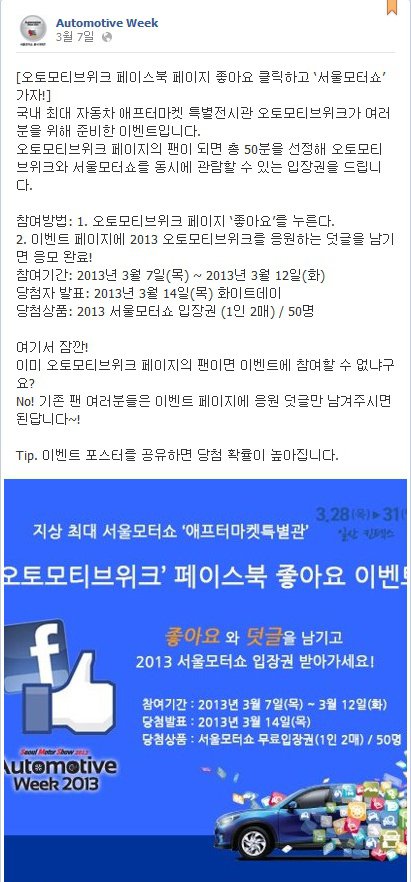 서울 모터쇼 애프터마켓의 특별 전시관인 오토모티브위크의 페이스북 이벤트!