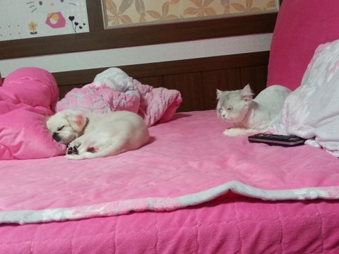 고양이와강아지는싸울거라고생각하시는분들이많으신데 생각보다 고양이와강아지함께키우시는데 큰문제는없어여. 고양이도강아지도 오래같이살다보면 가족이란걸아는지 저렇게 침대에서 같이자기도해여~글솜씨가없어서 죄송합니당...흐뭇한표정으로 우리이쁜냥이와강쥐사진구경하고가셨음해서올려봤어여 ^^글을처음써봐서마무리를어뜨케해야하지ㅠㅠㅠ움...그럼 모두들즐거운하루되세여^^♥