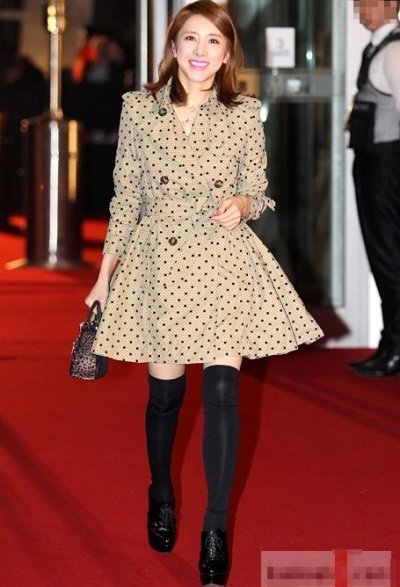 도트 무늬 트렌치 코트에 까만 니삭스를 끼얹었더니 걸리쉬 룩이 완성되었소..