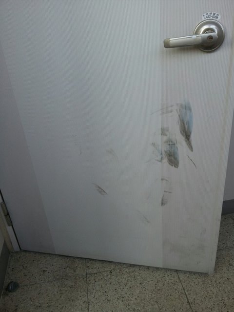 이건 아저씨가 저희집 현관문을 발로 차서 생긴 자국입니다.