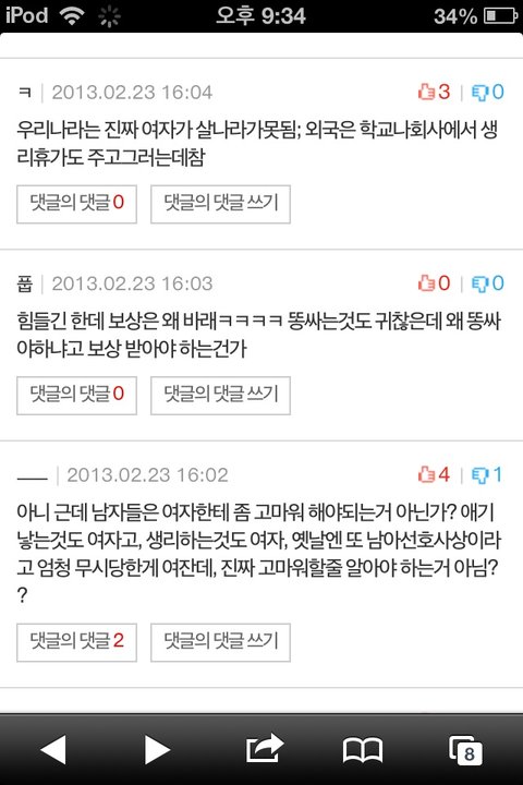 풉 이라는 댓글은 문제가 있지만 밑에 댓글 남아선호사상(조선) 전 고려시대 쯤은 여자가 약간근소한차이라 높았고 그리고 남아선호사상때 당했다고 지금 ㅈㄴ 복수해야되나? 라는건개소리 그리고 출산율 최저 인데 그소린그만하고 출산이랑 군대랑 비교는 ㅄ 이고 위에댓글은 안주는 회사가 문제 그리고 어떤 여성ceo 가 한국 여자 , 여성단체 ㅈㄴ 싫어하는거 모르나 생리휴가를 주는데 모든 여자들은 금요일만 생리를 하나봐?