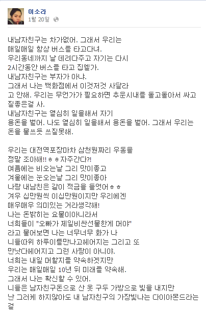 어이가 없다 저렇게 글써서 나는 개념있어요뿌잉뿌잉 하고싶은거?ㅋㅋㅋ... 너희들처럼 뭐 하루사귀고 헤어지는..ㅋㅋㅋ 여기서 너희가 누굴 지칭하는지 모르겠지만 결론은 지들연애는 로맨스고 남들은 삼류연애다 이거네?ㅋㅋㅋ 다른 커플들도 다 그렇게 사겨 너네 커플이 무슨 대단하고 엄청나다고 생각하지말아라 시대가 변하고 세상이 변해갈지언정 사람사는건 그래도 비슷비슷하고 연애도 비슷비슷하다 너무너무화나는 무슨..말투 오글 터지네 자기네들만 특별하다는 양 심지어 나는 그런 남자친구를 다 보듬어주는 특별한 여자라는 양 내보이고싶어 안달났네 정말 저런 행동이 맞다고 생각하는 여자는 저런글 쓰지도 않는다... 저렇게 다 하나하나 의식하고 글에 쓴 것 자체가 지 행동이 무지 칭찬받을만한 행동이라는걸 다 안다는거다... 아 소름끼친다..ㅋ