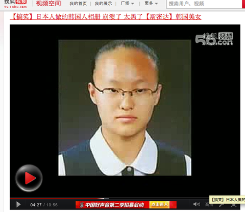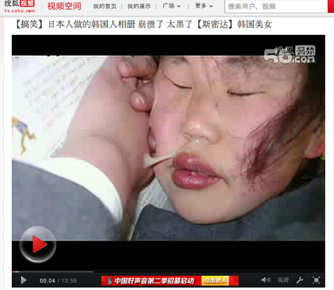 정확하게 동영상 이름은 【搞笑】日本人做的韩国人相册 崩溃了 太黑了【斯密达】韩国美女요즘 중국어 하는 사람들이 많아져서 알아듣는 사람들은 아시겠지만, 번역하면 [웃긴동영상] 일본인이 만든 한국인 앨범 멘붕이다 [습니다] 한국미녀입니다. 여기서 '습니다'는 한국인을.. 별로 좋지 않은 (폄하) 하는 단어입니다. 중국에는 짱깨가 있듯이요..