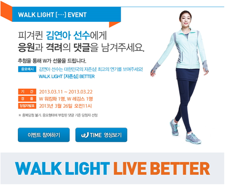 이번 이벤트는 추첨을 통해 경품도 주는데요!!!경품은 바로 광고 속에서 김연아가 입었던 연아 워킹화 그리고 연아 레깅스 ㅋㅋ왠지 신기만 해도 가벼운 마음이 될 것 같은 민트색 김연아 워킹화!!그리고 입기만 하면 연아처럼 날씬해 보일 것 같은 김연아 레깅스!!