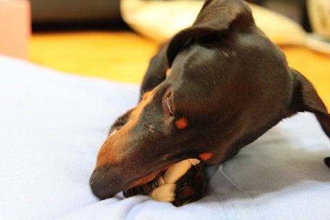 평소 잘 물었뜯는 장점을 살려 개껌을 맛있게 잘 씹음