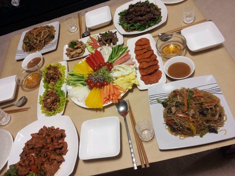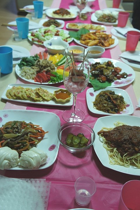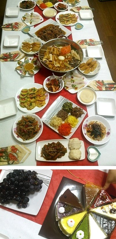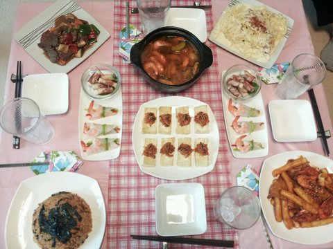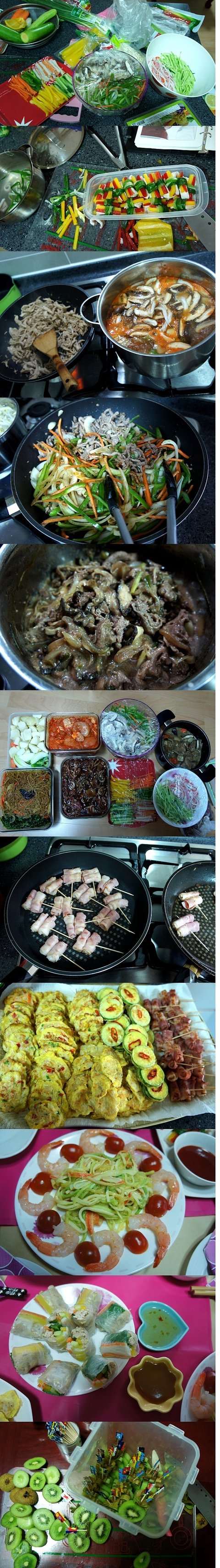 닭볶음탕, 해파리냉채,월남쌈,오징어강회,소불고기,돼지갈비,고추잡채,동태 호박 크래미 전, 베이컨떡말이,잡채, 소고기버섯탕. 밥, 각종반찬, 과일후식......