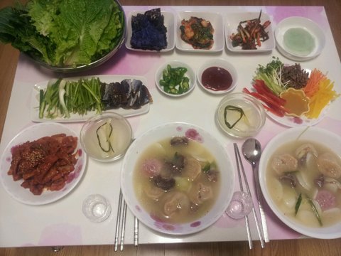 신랑 친구 만두국 드시고 싶다길래 떡만두구 무쌈 제육볶음 과메기 .각자 동치미. 한상~