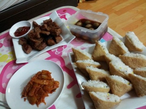 이건 유부초밥 함박스테이크 (또나왔네 산거지만안녕ㅋ)볶음김치와 메추리알은..그냥샀어요 먹고싶어서