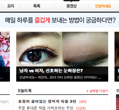 2탄이 인기가좋아서 ㅜㅜ 3탄올리기 좀..무서운데~ 그래두 올리겠습니다!요번엔 흔히말하는~ 남자들이좋아하는 눈화장 (색조 별로없고, 발랄한 핑크+코랄 눈화장) 에서..바로 찐~한 갈색 아이새도랑 블랙 아이라이너로 여자들이 좋아하는 눈화장을 갖고왔습니다!