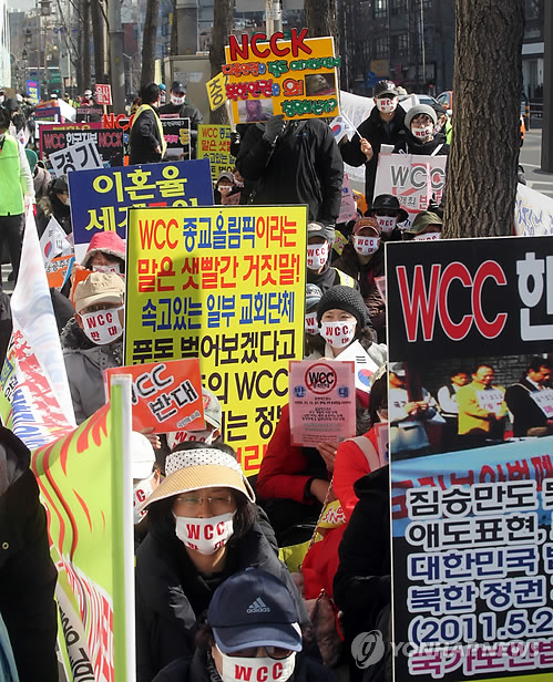 (서울=연합뉴스) 한상균 기자 = 세계교회협의회(WCC) 부산총회 개최를 반대하는 집회가 21일 오전 서울 문화관광부 앞에서 열리고 있다. 한국기독교보수교단협의회와 WCC 부산총회 철회촉구 위원회가 공동주최했다. 참석자들은 보도자료를 통해 WCC는 종교단체를 가장한 공산주의 단체라고 주장했다. 2013.3.21