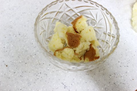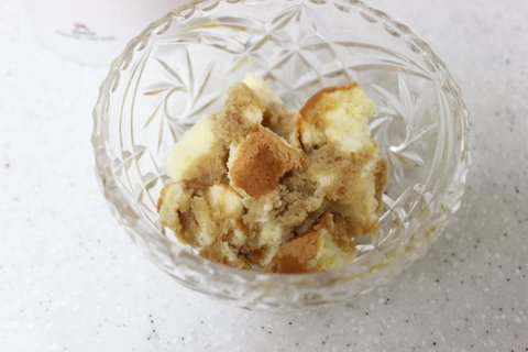 4. 다음은 카스테라를 손으로 조각조각 떼어내서 그릇에 깔아주세요.