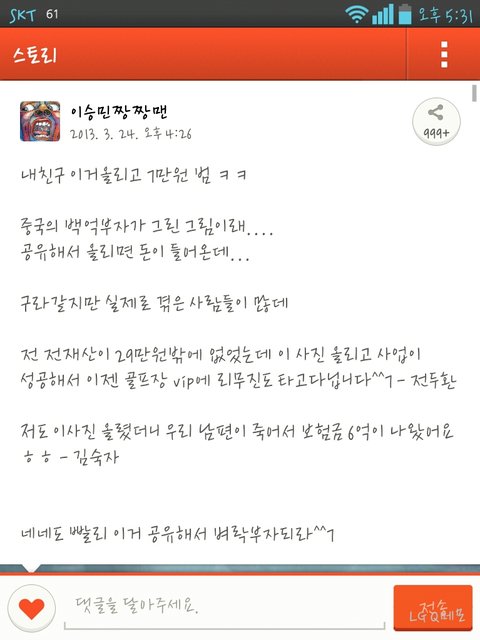 카스완전빡감. 옛날엔 색깔미션으로 도배됬는데 이젠 똑같은공유글만 몇개씩쳐올라옴ㅡㅡ차라리색깔미션이더낫다.