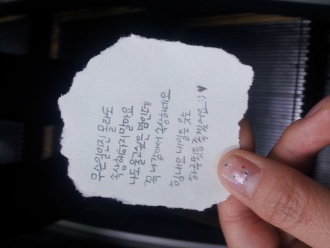 눈물이 멈추지않더라고요 안되겠다싶어서 건대입구역에서 그치고 가야지 하고 내리려하는데 어떤 분이 이 쪽지를 건내주시더라고요...
