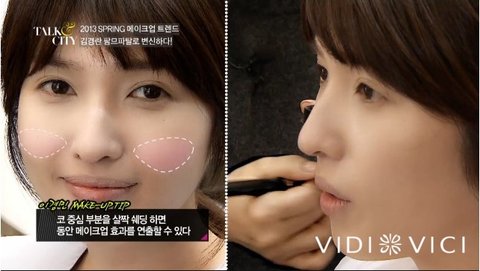 그리고 나서 코 중심 부분을 살짝 섀이딩하면 좀 더 어려보이는 동안 메이크업 연출이 가능하답니다.