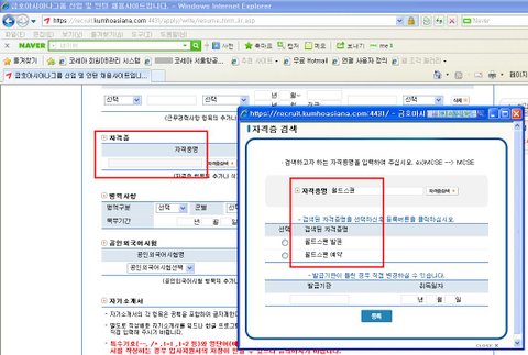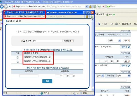 이것은 실제로 아시아나항공 이력서 쓸때 검색을 통해서 작성하는 부분입니다.