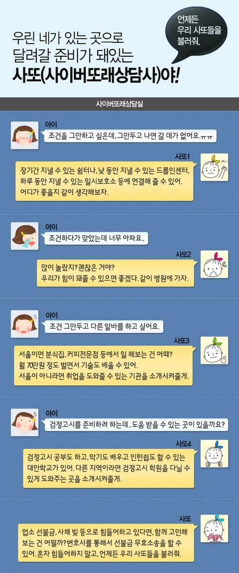 위기상황을 경험하고 있는 친구들 또한 인터넷에서 만난 낯선 사람의 친절을 조심하셔야 합니다. 특히 성구매자로부터 협박을 당하는 경우에는 그 상대에게 맞춰서 해달라고 해주시기 보다는 답변을 하지 마시고 그 사람이 보낸 문자, 통화녹음, 기타 자료 등을 따로 저장하신다음 성매매피해상담소 및 저희 사이버또래상담실로 연락주시면 부모님에게 알리지 않고 도움을 받으실 수 있습니다.