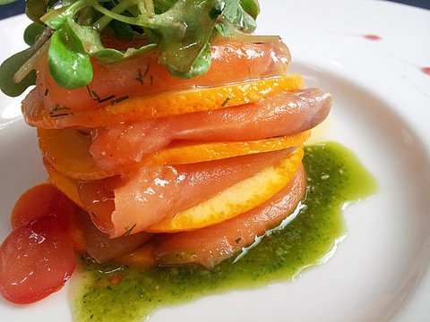 시판용 냉동 훈제 연어에 오렌지를 아주 얇게 썰어서 층층이 쌓았음