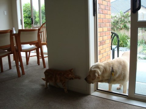 (이 큰 개는 잠시 우리 집에 맡겨진 개로 개가 아주 순한 성격이었고 애기는 성격이 드센 고양이로 컸을 뿐이고..)