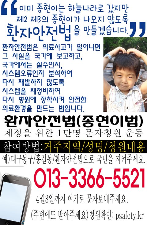 그 요구가 점점 발전하여 지금의 환자안전법(일명 종현이법)으로 거듭나게 되었습니다.