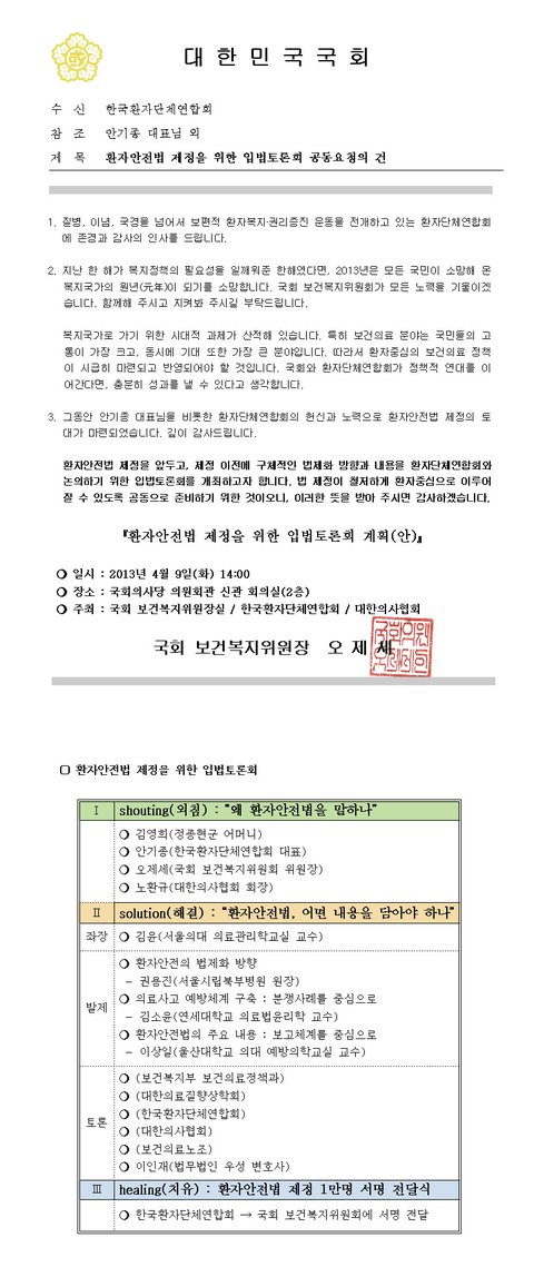 국회공청회에 맞춰 환자안전법 제정을 청원하는 문자서명을 제출하려고