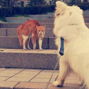 산책 나가면 자기 4/1 정도 밖에 안되는 아가들에게 겁먹고 제 옆에 딱 달라붙어 있어요.