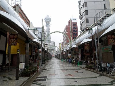 츠텐카쿠까지 가는 길은 조용한 일본 상점들이 줄지어 있음