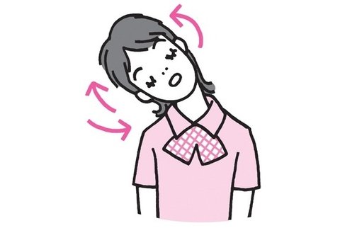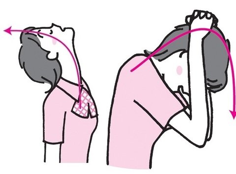 숨을 내쉬면서 머리를 앞으로 구부려 목을 늘어뜨리면서 같은 방법으로 반복해주면