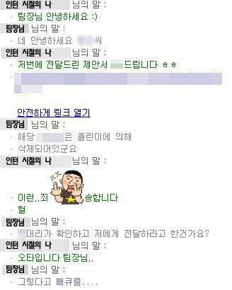 팀장님이 계신 줄 모르고 그룹 채팅방에 "누가 제안한 거죠?" 라고 썼다가