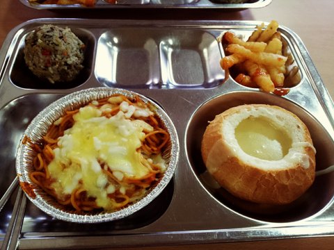 우린빵과스프가따로나와서우리가스스로스프를빵에넣어서먹어야하고 스파게티소스에물을조카쳐넣어서물파게티임