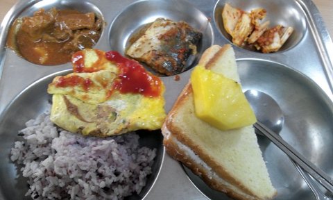 (돼지고기 갈비찜? 그런거, 고등어조림, 계란 오믈렛, 샌드위치위치)